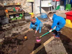Outside in the Early Years garden, an area has been created especially for digging. The children have been having great fun digging holes, raking, collecting stones, making 'mud soup' and discovering what happens when the hole gets flooded with water.